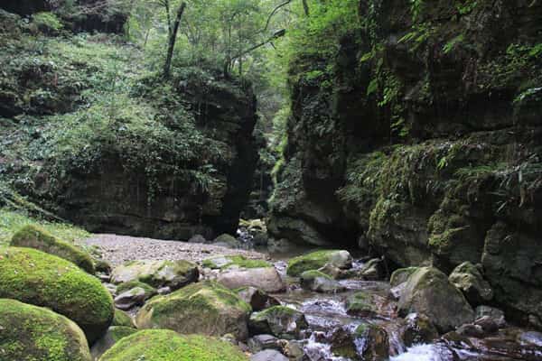 神旅集团董事长廖明尧带领考察组先后来到阳日镇龙溪村和武山村,实地踏查了“菜园子”到“简城河口”一带的山林、河流、峡谷和村落。在武山村,一处被称为“月亮洞”的小景观吸引了考察组的注意,环视周围,发现那里山峰奇特,在云雾朦胧中颇有意境。顺山势而下,工作组试图从山崖之巅下到“简城河”,因近期下过雨,泥泞的山路加上山崖的青苔使得行程更加艰难,但为寻找到最佳景观,考察组一路还经历了被当地人称之为 “退三步、阎王鼻子、鬼门关”等地,最终来到峡谷中心地段。峡谷曲折幽深,周围植被茂密,河水碧波荡漾、清澈见底,河床由很多嶙峋怪石且有青苔相伴,峡谷深约百多米,最宽处约8米,最窄处约有2米,部分地段水流落差达二十多米,考察组只能借助绳索岩降前行。
